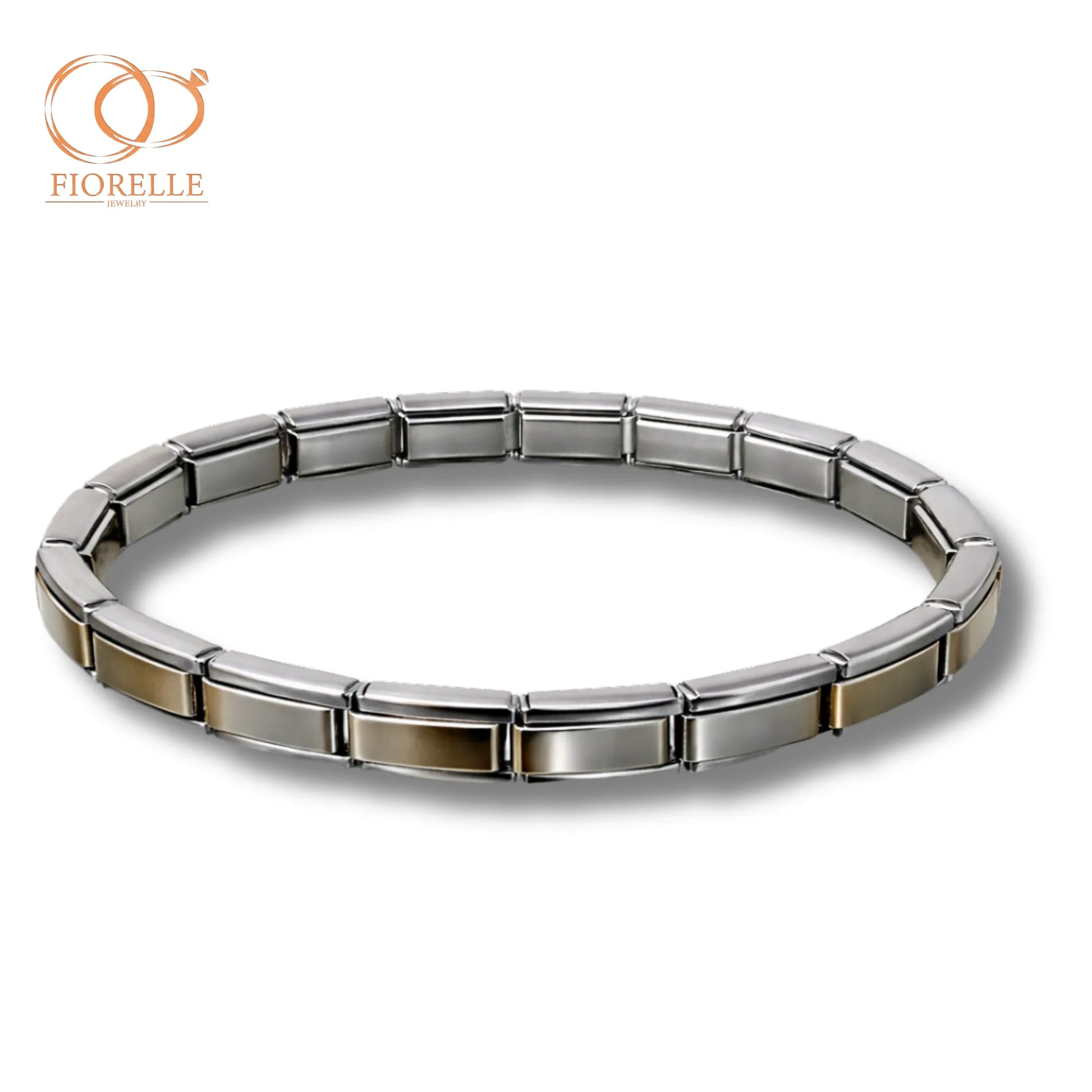 Pulsera de diseño estructurado compuesta por eslabones rectangulares con acabado satinado en tono plateado y detalles centrales en tono dorado.